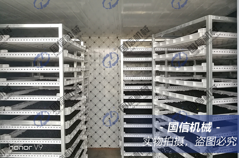 桑葚是高糖分、高水分含量的漿果,較長(zhǎng)果形是由一個(gè)一個(gè)小果囊的形狀組成,水分難以出來(lái),所以需要較長(zhǎng)的時(shí)間。同時(shí)烘干溫度又不能太高,溫度太高,就容易影響花青素的有效含量。烘干第一階段溫升一小時(shí),不排濕,烘干模式,讓烘干房上升至50度左右。第二階段設(shè)為烘干+排濕模式,目標(biāo)濕度為60%,目標(biāo)溫度設(shè)為55度。第三、第四階段每一階段上升5度,目標(biāo)濕度下降10%,讓烘干房不斷排濕。最終一個(gè)階段目標(biāo)濕度設(shè)為15%左右。如果條件許可,可以考慮在第四階段末了,停機(jī)靜置一段時(shí)間再?gòu)?fù)烘,這樣果干內(nèi)部的水份滲出后被復(fù)烘的熱量加熱揮發(fā),果干果形更好,同時(shí)總體能效更好。