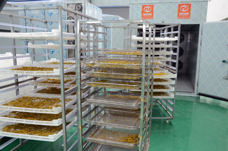 3.烘干:將蒸制后的花蕾均勻地攤在烘盤上或烘網(wǎng)上進行烘干,烘干溫度為50℃~70℃為宜,終了水份為14%即可。